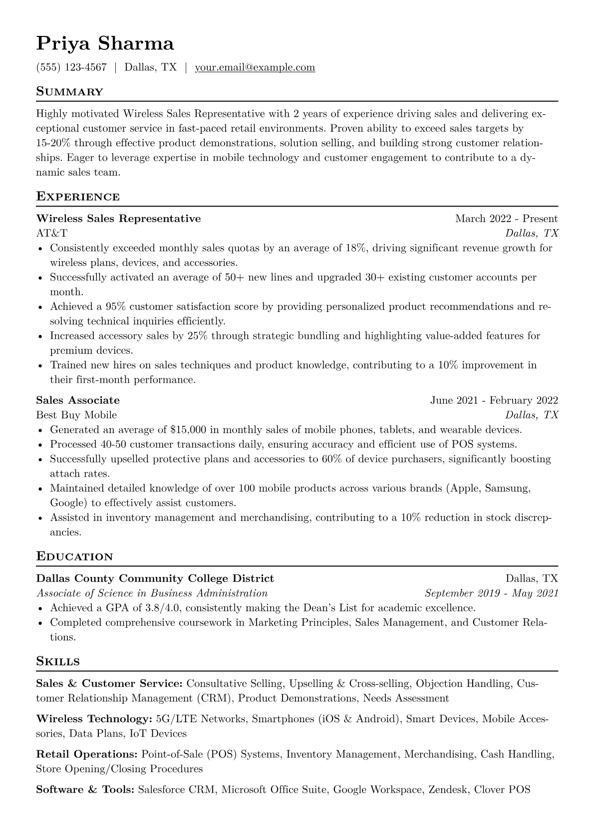 This template was built with JobSprout and can be remixed to create your own tailored Wireless Sales Representative resume. Take inspiration from its structure and focus on concrete achievements to build your own impactful application.