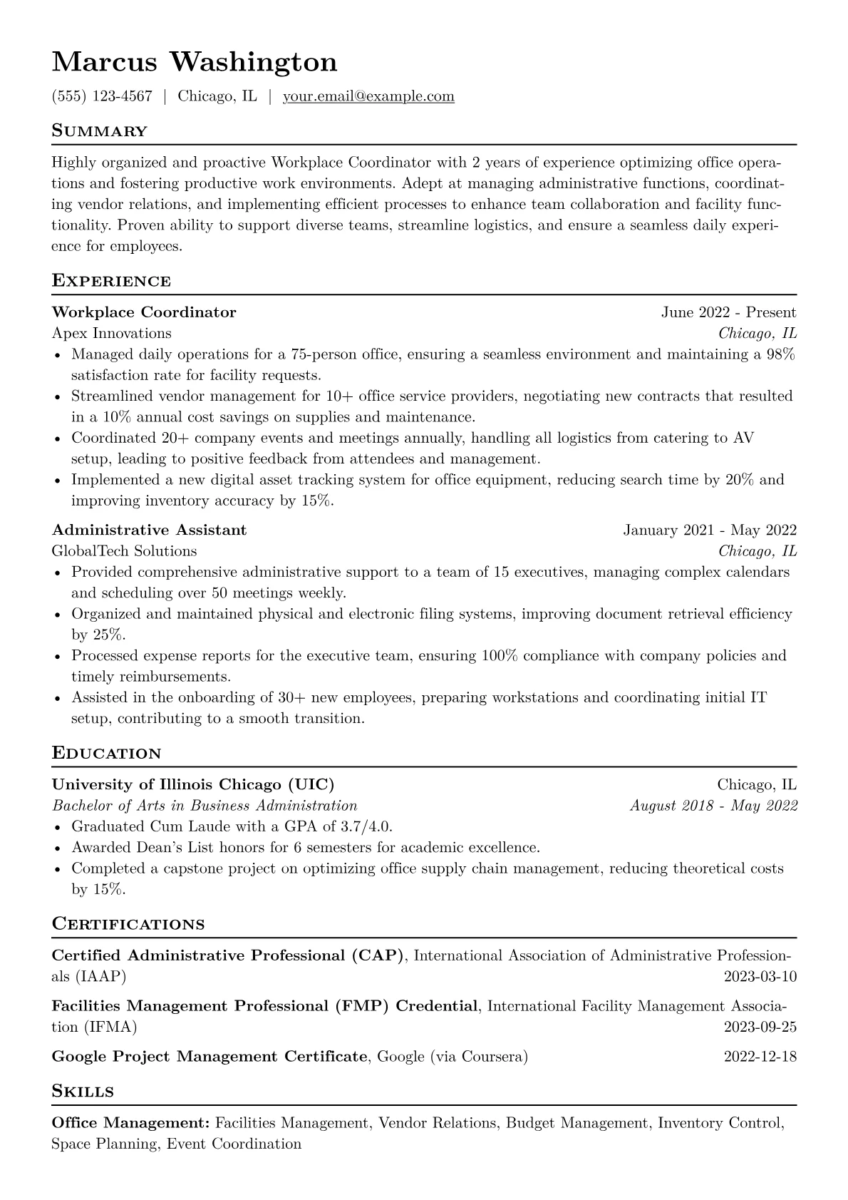 This template was built with JobSprout and can be remixed to create your own tailored Workplace Coordinator resume, optimizing it for your unique experience.