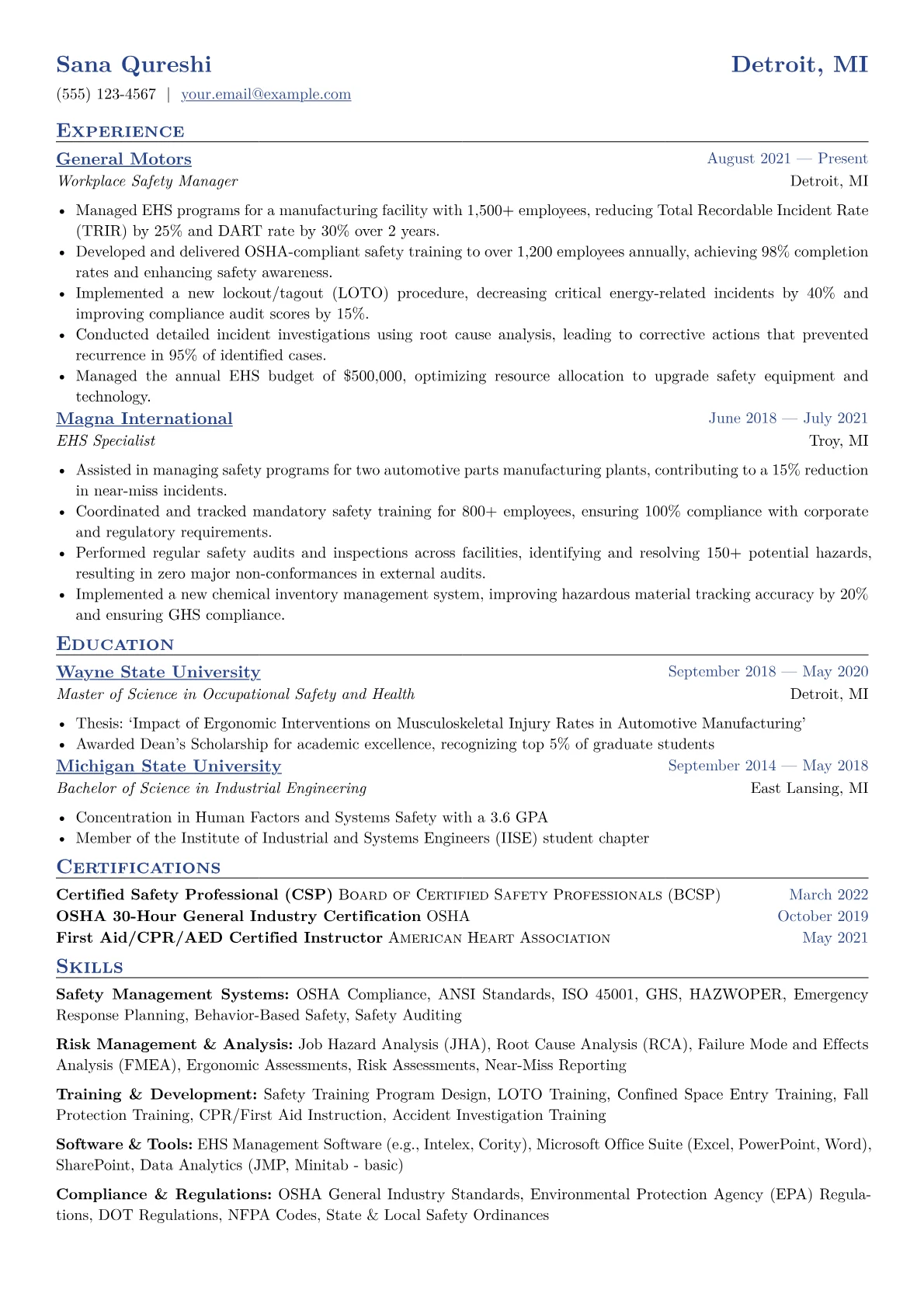 This effective template was built with JobSprout, allowing you to easily remix and customize it to create your own standout Workplace Safety Manager resume.