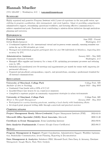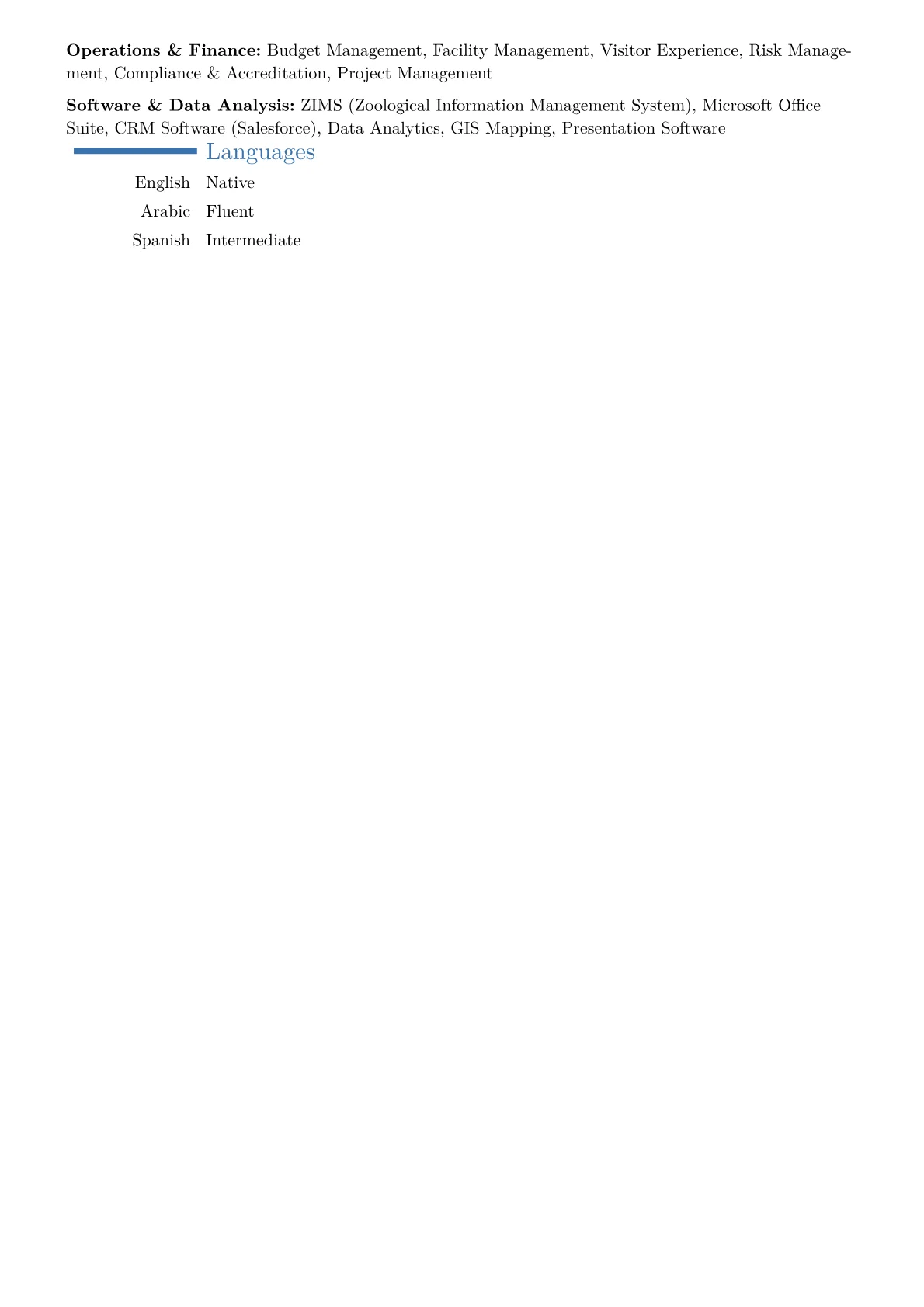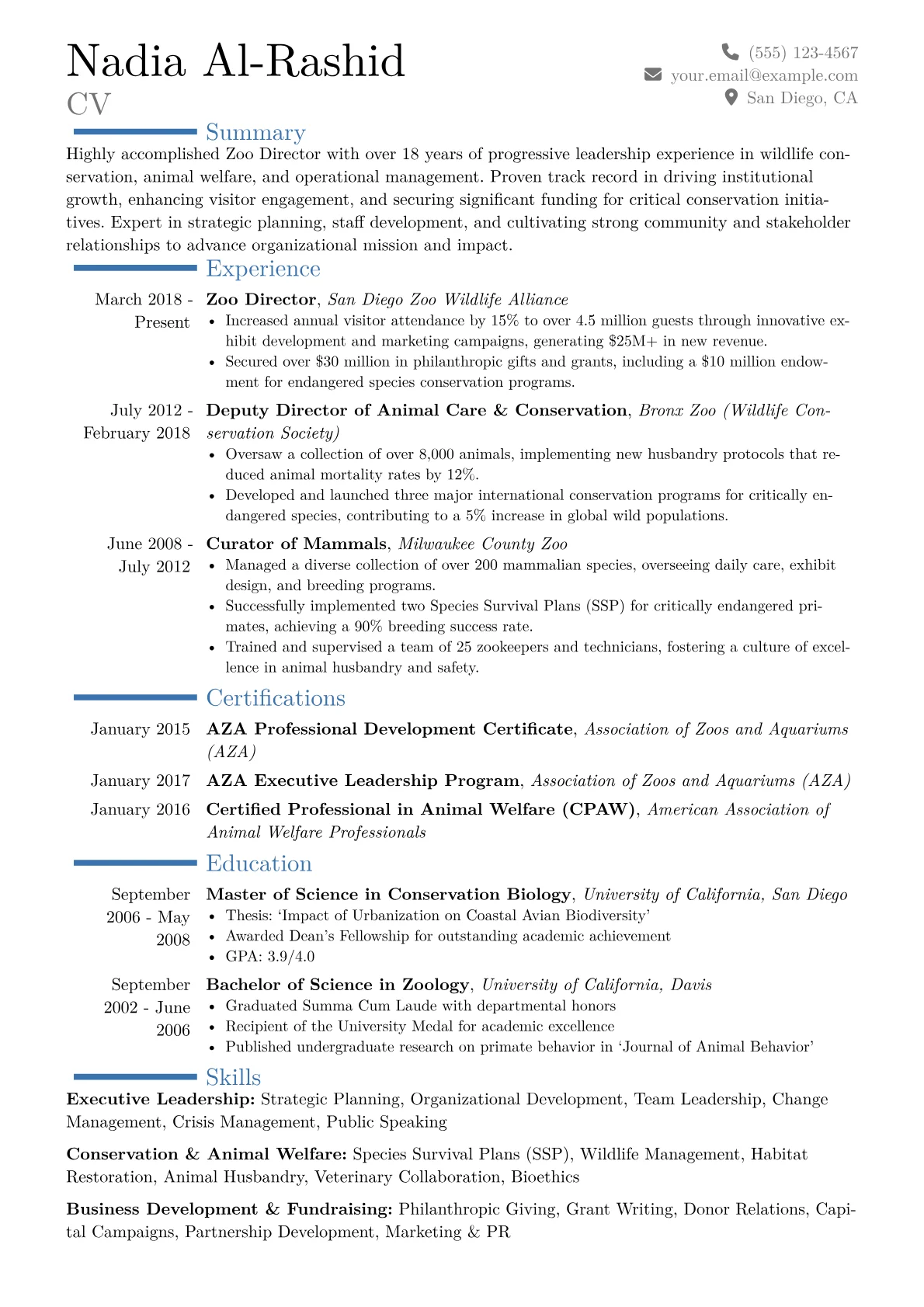 This example resume effectively showcases these critical elements. It thoughtfully groups specialized skills under headings like "Conservation & Animal Welfare Leadership" and "Operational & Financial Stewardship," making complex expertise immediately clear. Achievements are consistently quantified, for instance, detailing specific percentages of increased program participation or dollar amounts raised for new exhibit development. Highlighting certifications relevant to zoo management, such as AZA Professional Development certificates, and proficiency with specific conservation databases or fundraising CRM tools, further reinforces a candidate's executive-level readiness for this unique role.
