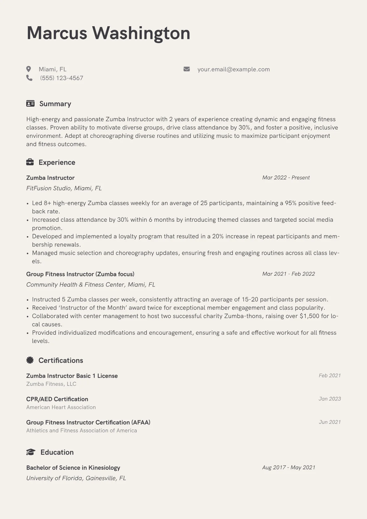 This example resume effectively showcases these vital elements. It quantifies achievements by stating specifics like "maintained an average class attendance of 25 participants" or "received 95% positive feedback ratings from post-class surveys." Skills are thoughtfully grouped, separating "Zumba Specialties" (e.g., Zumba Toning, Zumba Kids) from broader "Fitness Instruction Skills" like cueing and musicality, providing immediate clarity. Furthermore, all relevant certifications, including Zumba Basic 1 and CPR/AED, are prominently listed with their acquisition dates, assuring recruiters of current qualifications and readiness to lead dynamic classes.
