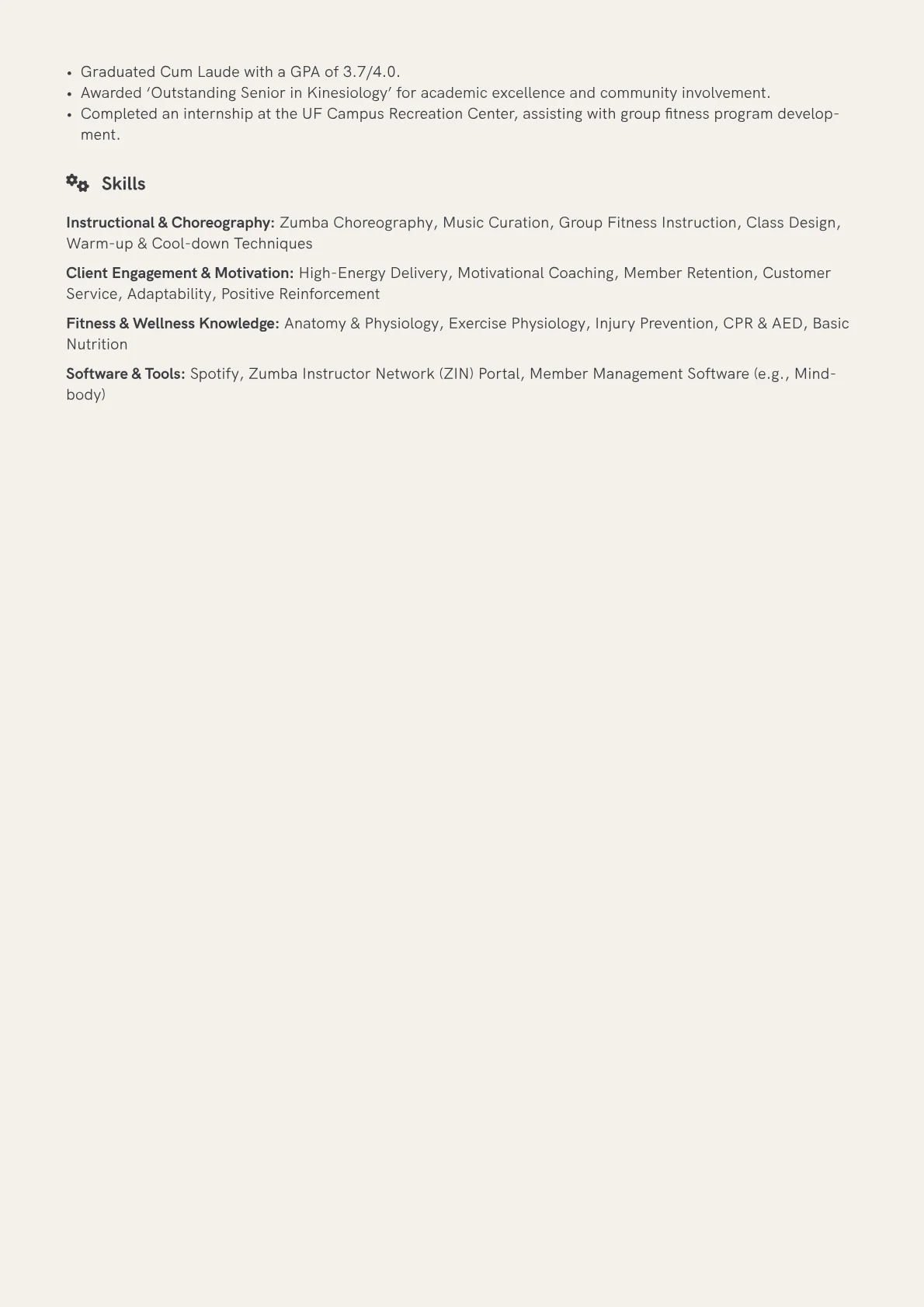 This template was built with JobSprout and can be remixed to create your own tailored Zumba Instructor resume, ensuring your unique flair shines through.